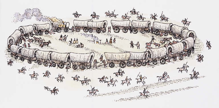 Imagen 3. Círculo de carretas idealizado para el antiguo Oeste pero que revela cómo sería la táctica real de protegerse tras los carros de los enemigos en la etapa migratoria de los godos. Fuente: bokertov.typepad.com.