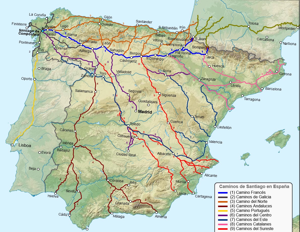 Imagen 1. Distintos caminos que acaban en Santiago de Compostela. Fuente: wikimedia.org